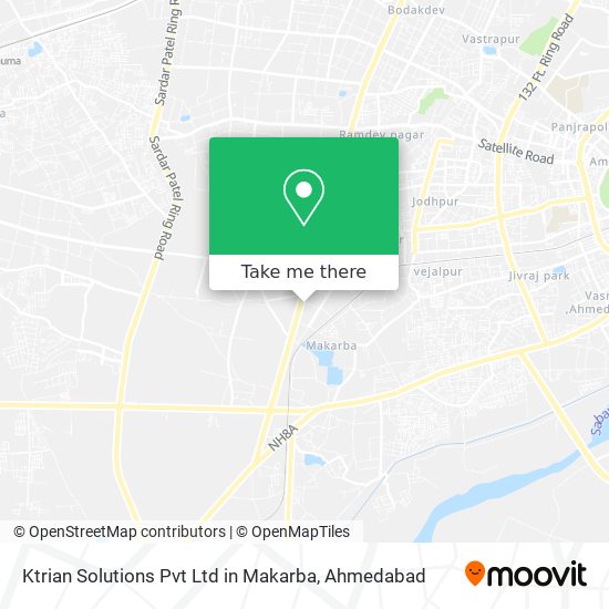 We make riding to Ktrian Solutions Pvt Ltd in Makarba, ahmedabad, West Gate B 1504 To 1505, S G highway, Near YMCA Cl easy, which is why over 930 million users, including users in Vejalpur, trust Moovit as the best app for public transit. You don't need to download an individual bus app or train app, Moovit is your all-in-one transit app that helps you find the best bus time or train time available.